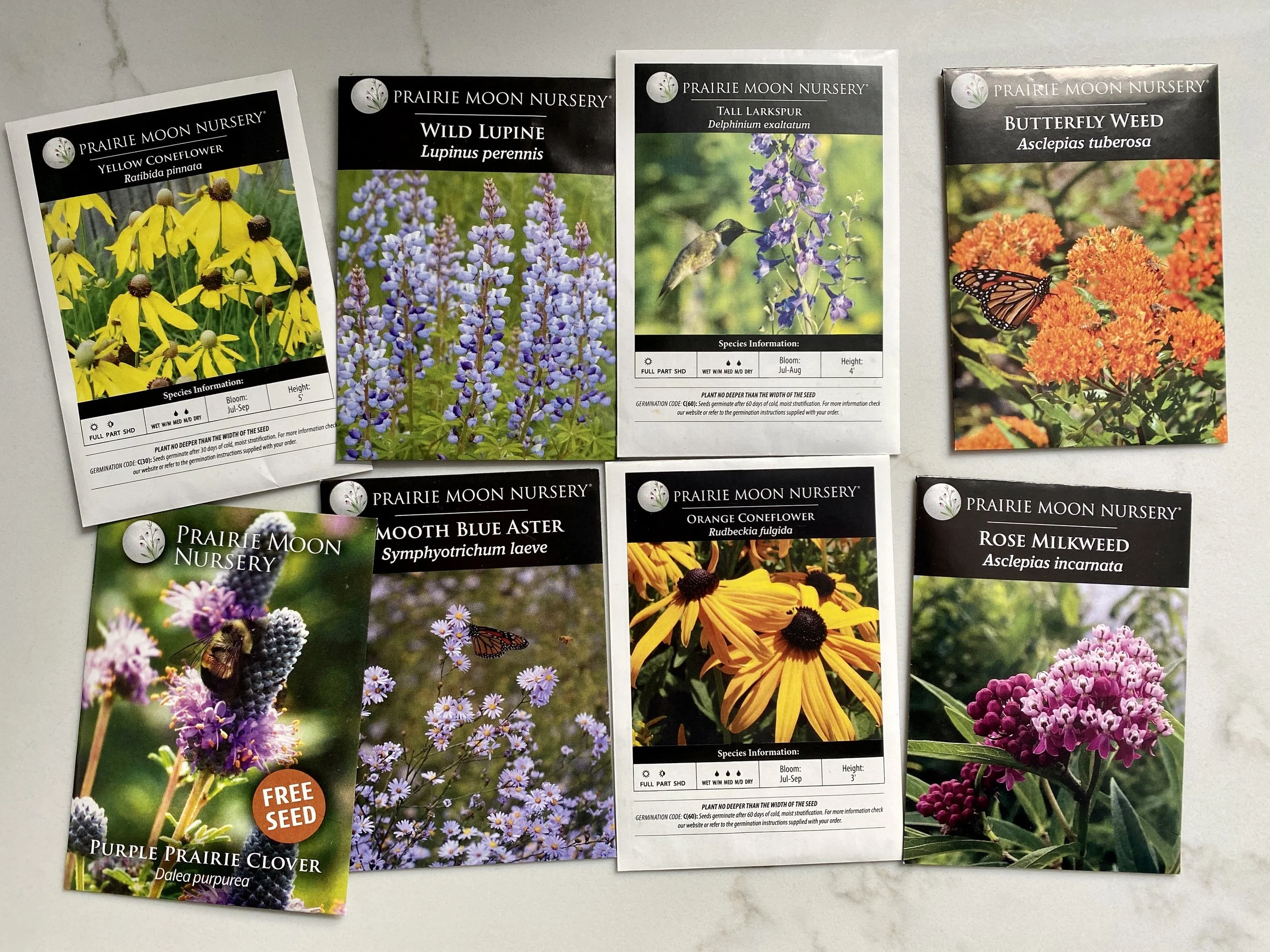 The seeds I’m starting are all native seeds from Prairie Moon Nursery. I like this company because they provide a ton of information about when to start each seed, as most of these particular seeds need a cold stratification period before they’ll germinate. I tried mimicking a multi-week cold period with Saponaria in the refrigerator last winter, but it was a no-go. Hopefully, these ones will like actually being outside a bit better. Prarie Moon also sent a packet of free seeds so that’s always a win in my book.
